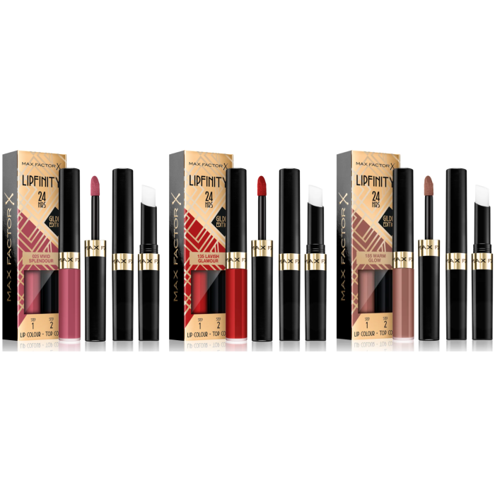 Max Factor Lipfinity 24HRS Duo Lip Colour + Top Coat Pack Of 3 Gilded Edition Long Lasting Impact, Gorgeous Colour For Up To 24 Hours 2 Step Lip Colour; Step 1: Apply Colour To Clean Lips. Keep Lips Apart For Up To 60 Seconds Step 2: Apply Clear Top Coat To Lock In Moisture And Add Shine Step 1: 2.3ml Lip Colour Step 2: 1.9g Top Coat Shades As Pictured = £2.50 Each Made In UK 025 Vivid Splendour EAN Number: 3616305242488 135 Lavish Glamour EAN Number: 3616305242525 185 Warm Glow EAN Number: 3616305242495