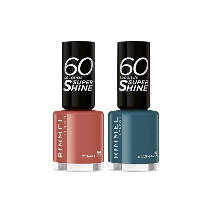 Rimmel 60 Seconds Super Shine Nail Polish Pack Of 3 Super Glossy, Ultra Shiny Nails Glide On One Stroke Quick Dry Nail Polish For Precise Application And High Impact Colour In 60 Seconds Lasts Up To 10 Days 8ml Nail Polish Sealed In Packs Of 3 Shades As Pictured = 75p Each Made In Spain 707 Tan-a-cotta EAN Number: 3614228081177 863 Star Gazin EAN Number: 3614229326925